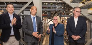 Mangrove’s electrochemical lithium refining facility ribbon cutting ceremony in Delta, B.C. Pictured from L to R: InBC Chief Investment Officer Thomas Park, Mangrove Lithium CEO Saad Dara, Delta MP Jill McKnight, and Delta Mayor, George V. Harvie. Photo by Avrinder Dhillon/Mangrove Lithium