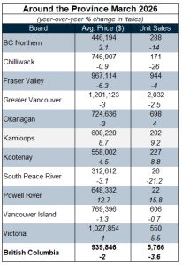 BRITISH COLUMBIA – The British Columbia Real Estate Association (BCREA) reports that 5,766 residential unit sales were recorded in Multiple Listing Service® (MLS®) Systems in March 2026, down 3.6 per cent from March 2025. The average MLS® residential price in BC in March 2026 was down 2 per cent at $939,846 compared to $959,236 in March 2025.