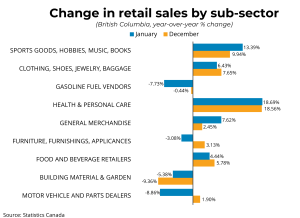 BRITISH COLUMBIA – Canadian retail sales increased by 1.1 per cent to $70.7 billion in January compared to the previous month. Retail sales were 1.5 per cent higher compared to the same last year. Furthermore, core retail sales, which exclude gasoline and automobile items, increased by 0.9 per cent in January.