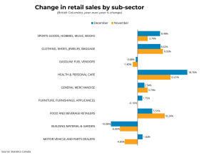 Retail sales in British Columbia were down 0.5 per cent in December month-over-month and rose by 2.6 per cent compared to the same time last year. In the CMA of Vancouver, retail sales were up 0.6 per cent from the prior month and were 3.6 per cent above the level of December 2024.