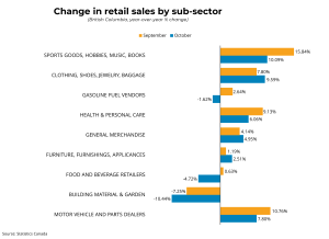 BRITISH COLUMBIA – Canadian retail sales decreased by 0.2 per cent to $69.4 billion in October compared to the previous month. Compared to the same time last year, retail sales were up by 2.1 per cent. Furthermore, core retail sales, which exclude gasoline and automobile items, decreased by 0.5 per cent in October. In volume terms, adjusted for rising prices, retail sales fell by 0.6 per cent in October.