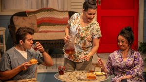 The cast “sleeper” performance came from Patrick, the lone male, expertly portrayed by Frankie Cottrell, a multidisciplinary Indigenous artist and graduate from the Musical Theatre Program at Capilano University. As plays go, it was expected that he would eventually become the love interest of visiting Beth, and he warmed his way into the crowd’s hearts with comical gestures and poignant one-liners.