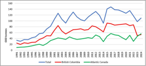 Figure 1. Production of farmed salmon by region, 1991 to 2024. Source: 2024 Aquaculture Industry Snapshot, Canadian Aquaculture Industry Alliance (CAIA), 2026. Data sourced from Statistics Canada. Table 32-10-0107-01.